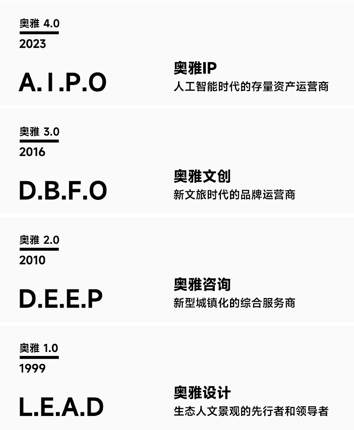 經過多年的戰略布局與發展,在李方悅女士的推動下,奧雅股份從一家設計企業成功轉型成為新銳的輕資產文旅開發運營企業。奧雅以“創造更美好的人居環境”“讓空間賦予生命”為使命,以雙輪驅動+雙引擎為發展格局,即創意設計+親子文旅雙輪驅動、AIGC+IP雙引擎;經營業務范圍涵蓋創意設計、親子文旅、數字科技等領域,為城市更新、鄉村振興、文化古城等不同場景提供全程化咨詢與綜合運營服務。在實現企業價值和理想的同時,解決當代中國的實際問題與需求,創造具有地域特色、人性化和充滿活力的新舊城市空間和綜合文化旅游項目。
